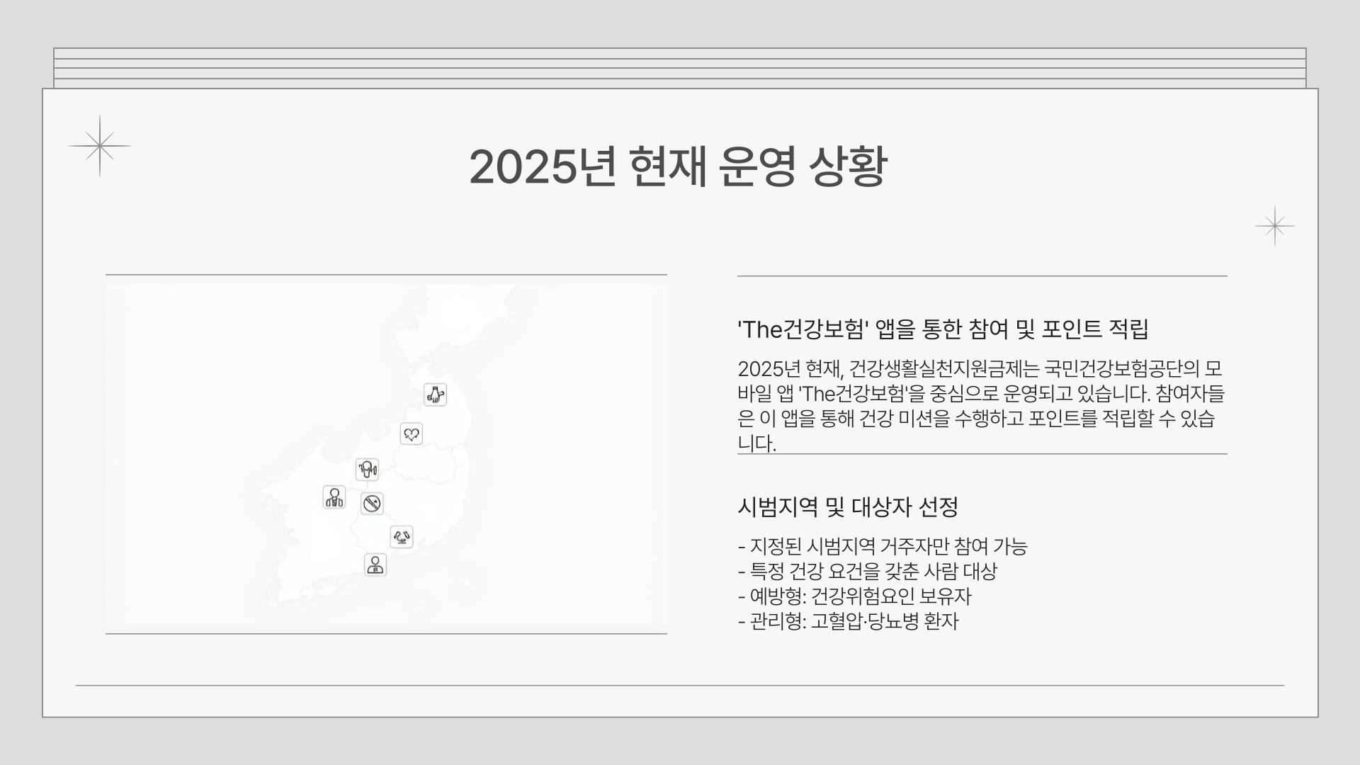 • 운영 방식: 국민건강보험공단의 모바일 앱인 **'The건강보험'**을 통해 주로 참여하고 포인트를 적립합니다.