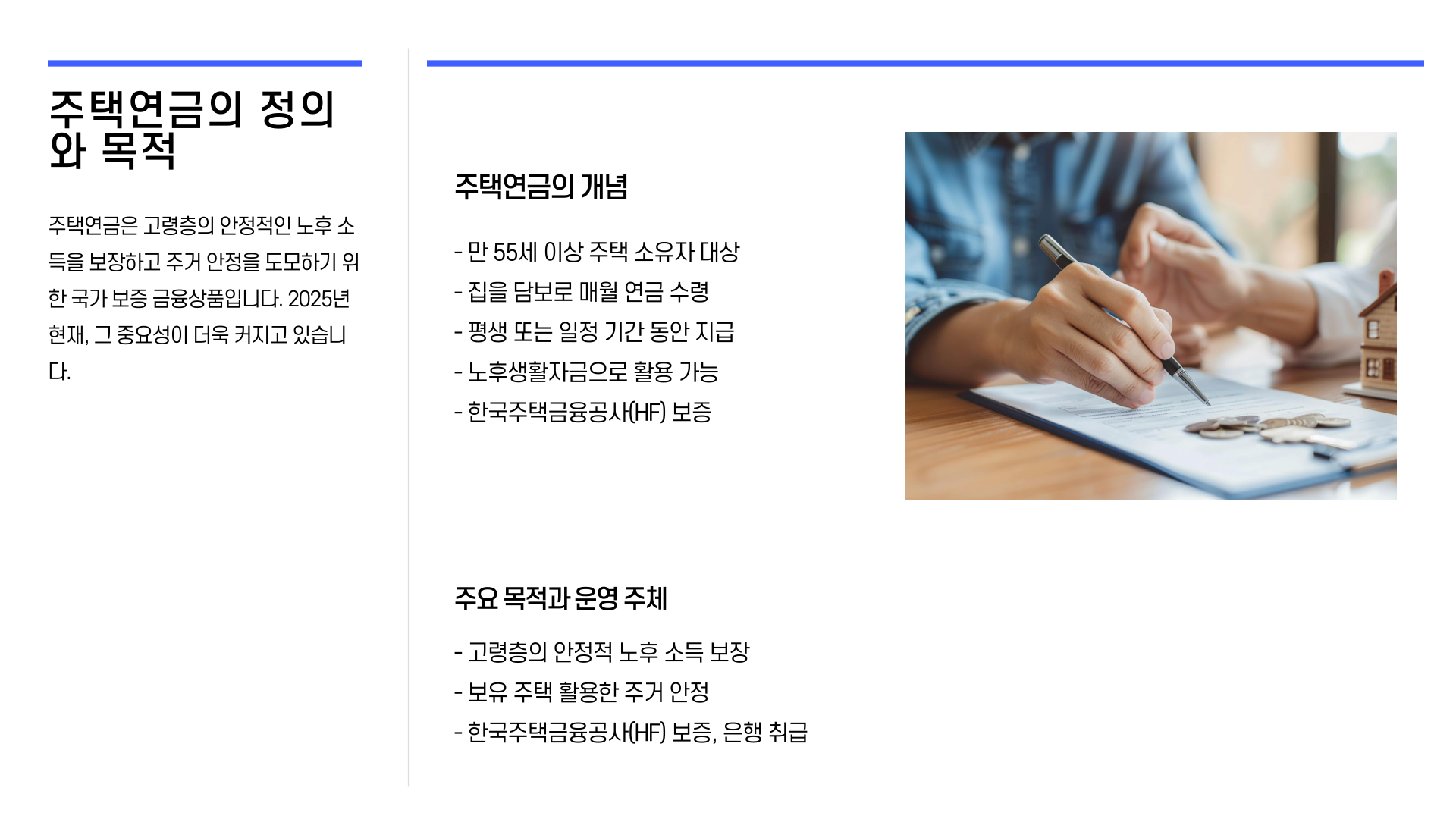 - 주요 목적: 고령층의 안정적인 노후 소득 보장, 보유 주택을 활용한 주거 안정 및 생활 안정.