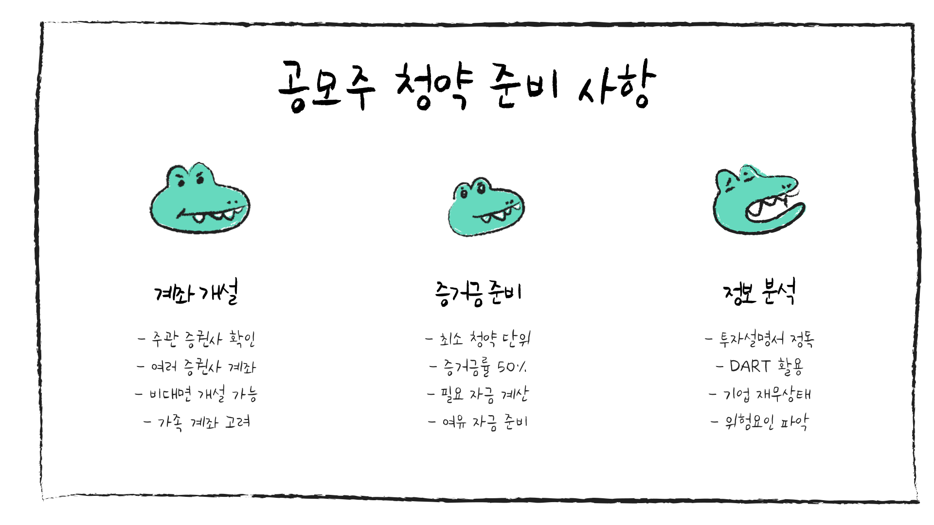 - 여러 증권사 계좌 미리 개설 추천:** 최근 '균등배정' 방식 도입으로, 여러 증권사에 계좌를 가지고 있으면 당첨 확률을 높이는 데 유리할 수 있습니다. (가족 계좌 활용 시 증여 문제 등 고려)