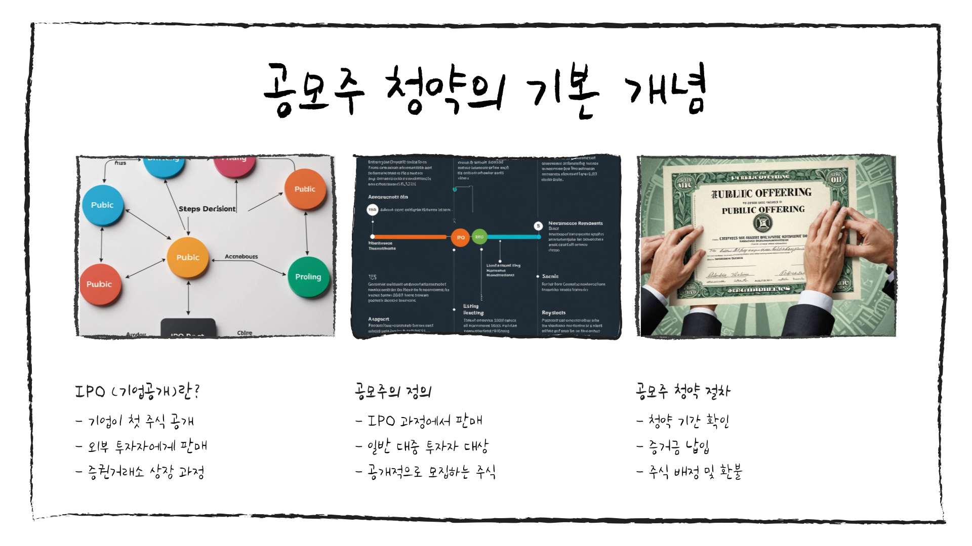 - 공모주 청약: 일반 투자자가 이 공모주를 공모 가격으로 배정받기 위해 정해진 기간 동안 신청하는 절차입니다.