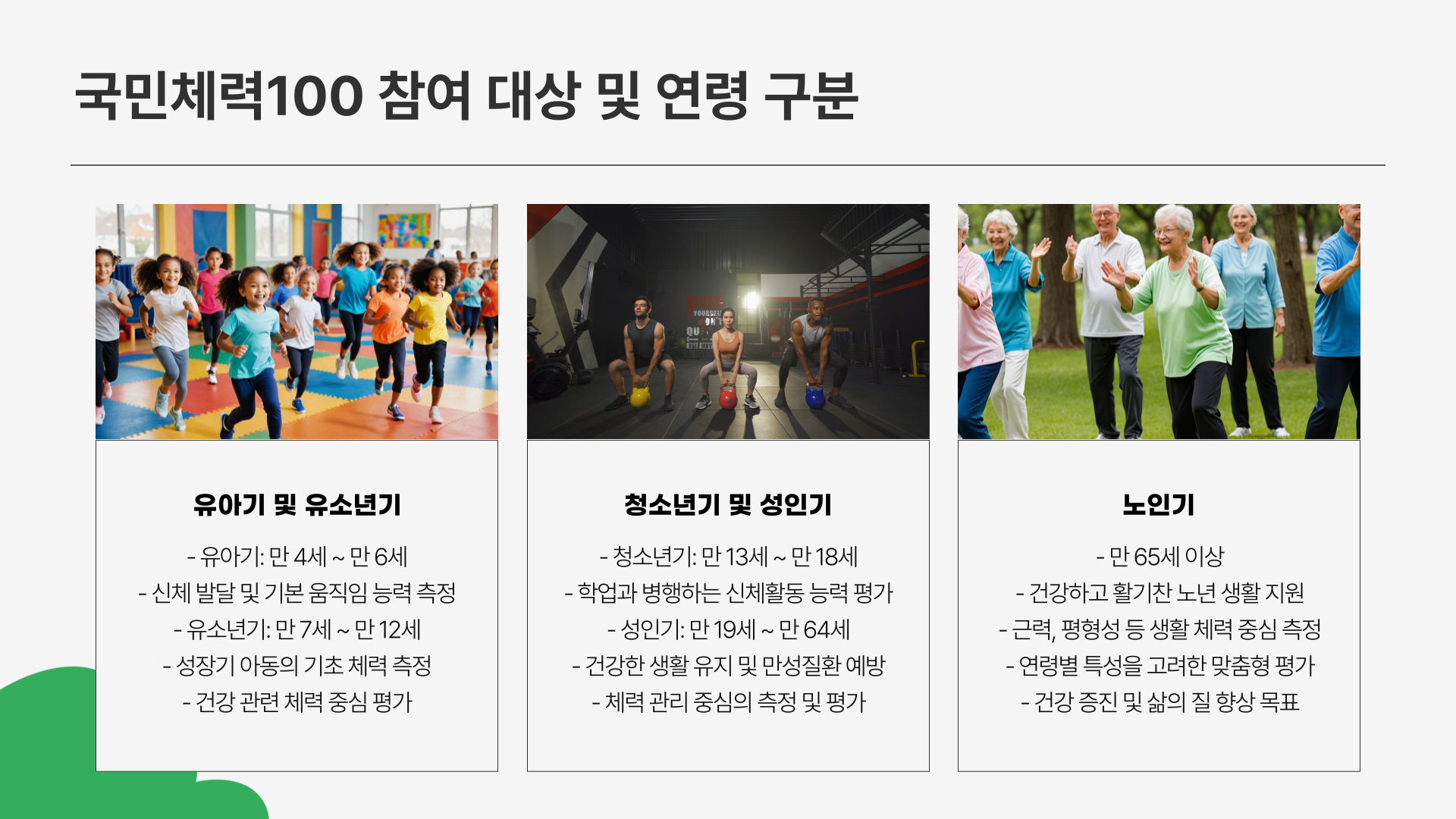 국민체력100은 대한민국 국민이라면 누구나 참여 가능하며, 연령에 따라 측정 항목과 평가 기준이 다르게 적용됩니다. 2025년 현재 일반적인 연령 구분은 다음과 같습니다. (정확한 최신 연령 기준은 국민체력100 공식 홈페이지에서 재확인 필요)