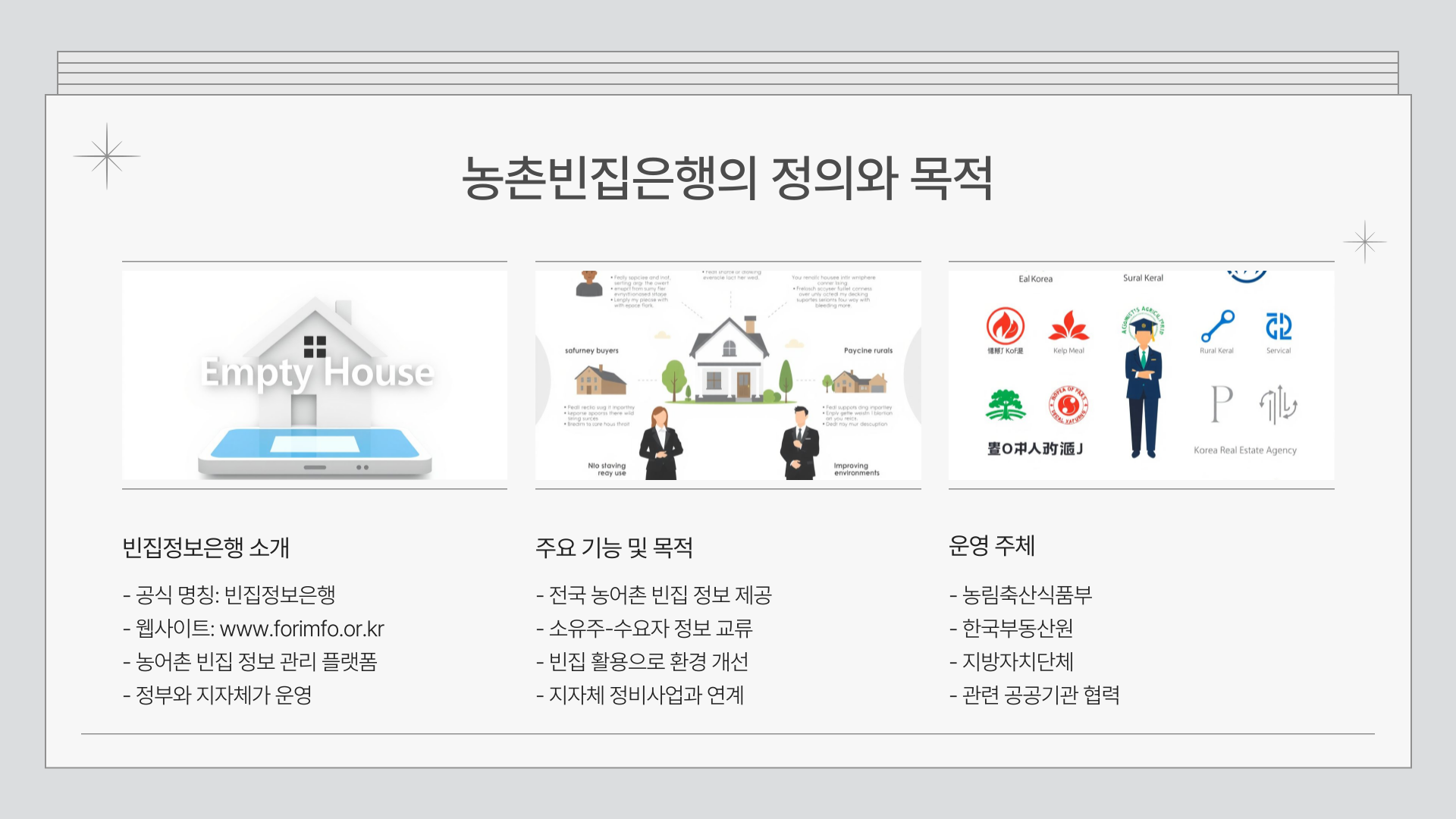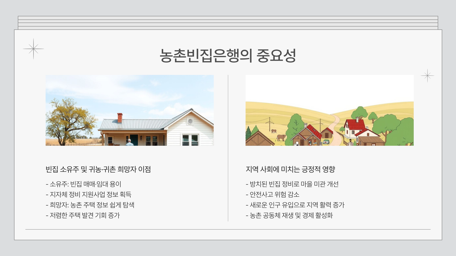 - 방치된 빈집의 효율적 활용을 통한 농촌 주거 환경 개선 및 지역 활성화.