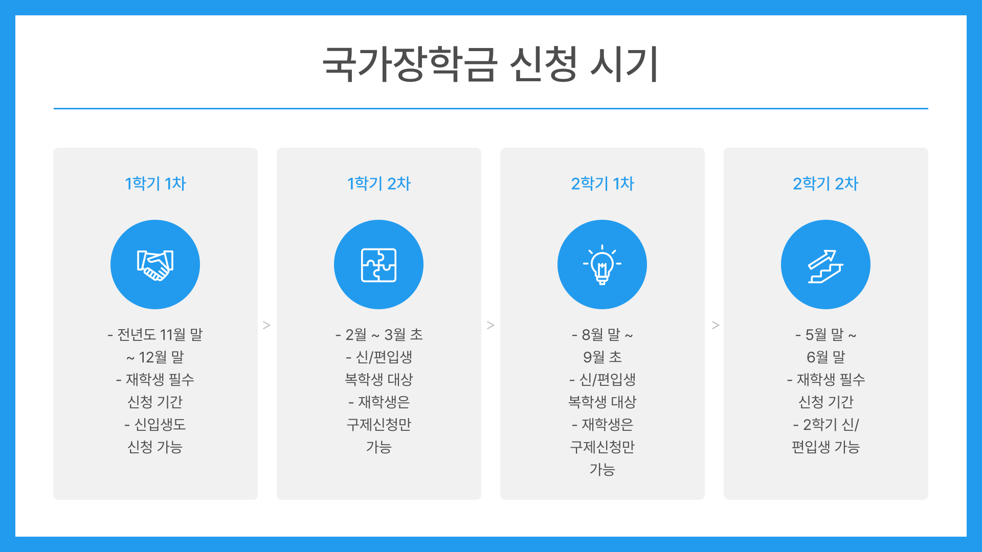 - 한국장학재단 국가장학금은 무조건 신청하세요! (1차 신청 원칙): 가장 기본적인 지원금이므로, 소득분위가 높을 것 같다고 미리 포기하지 말고 일단 신청하는 것이 좋습니다. 재학생은 반드시 1차에 신청해야 불이익이 없습니다.