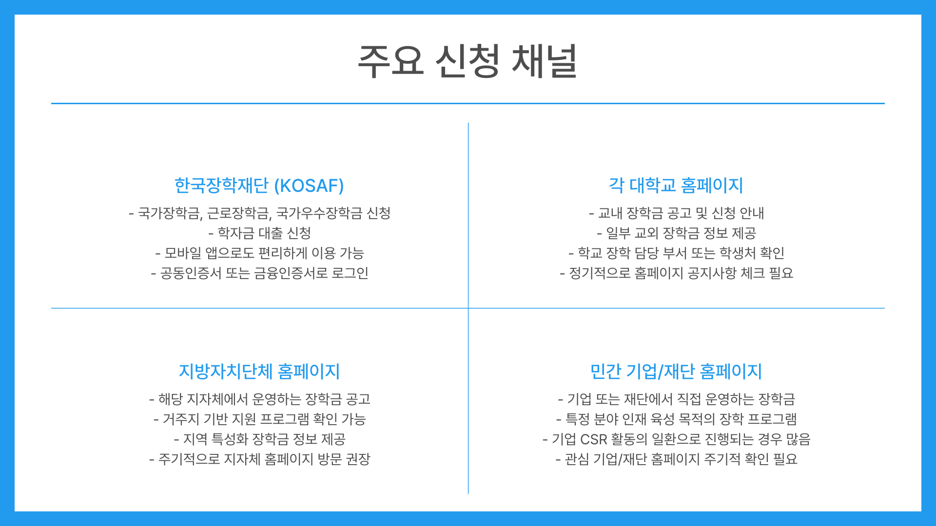 - 장학금 공고 '매의 눈'으로 수시 확인: 한국장학재단, 학교 홈페이지/게시판, 학과 사무실, 지자체 홈페이지, 장학재단 알리미 앱 등 다양한 채널을 통해 장학금 정보를 놓치지 마세요.