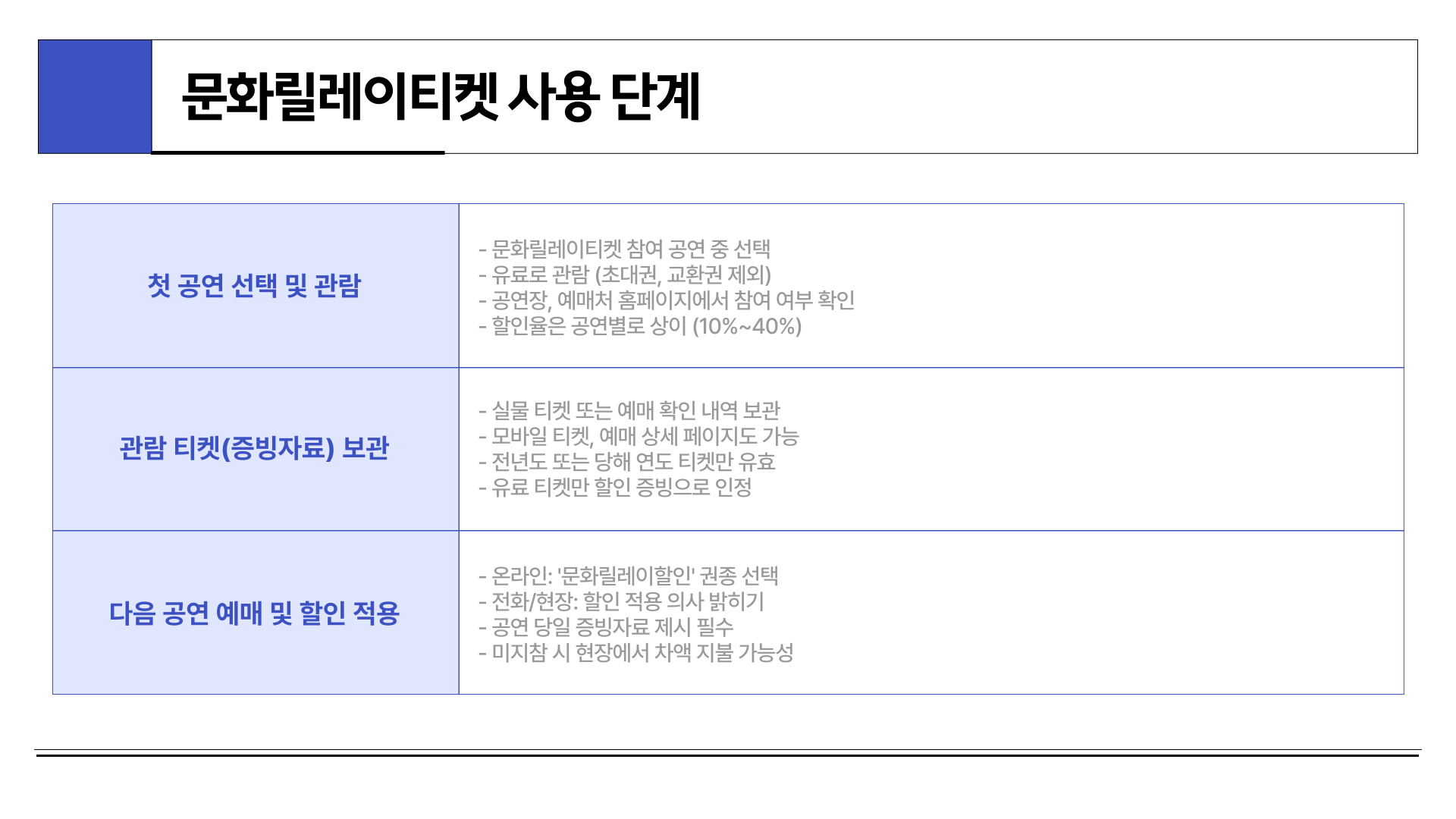 • 예매처별 정책 확인: 온라인 예매 시 각 예매처의 문화릴레이티켓 할인 적용 방식 및 증빙 절차를 숙지해야 합니다.
