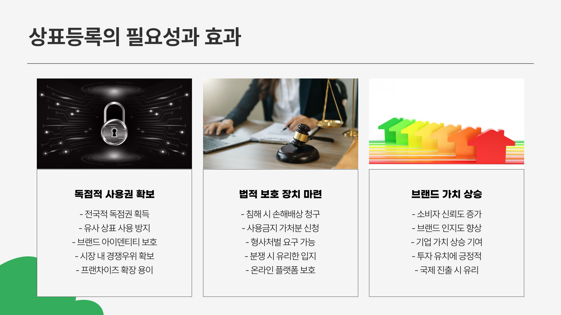 • 사업 확장 및 프랜차이즈 용이: 안정적인 브랜드 권리를 바탕으로 사업을 확장하거나 프랜차이즈 사업을 전개하는 데 유리합니다.