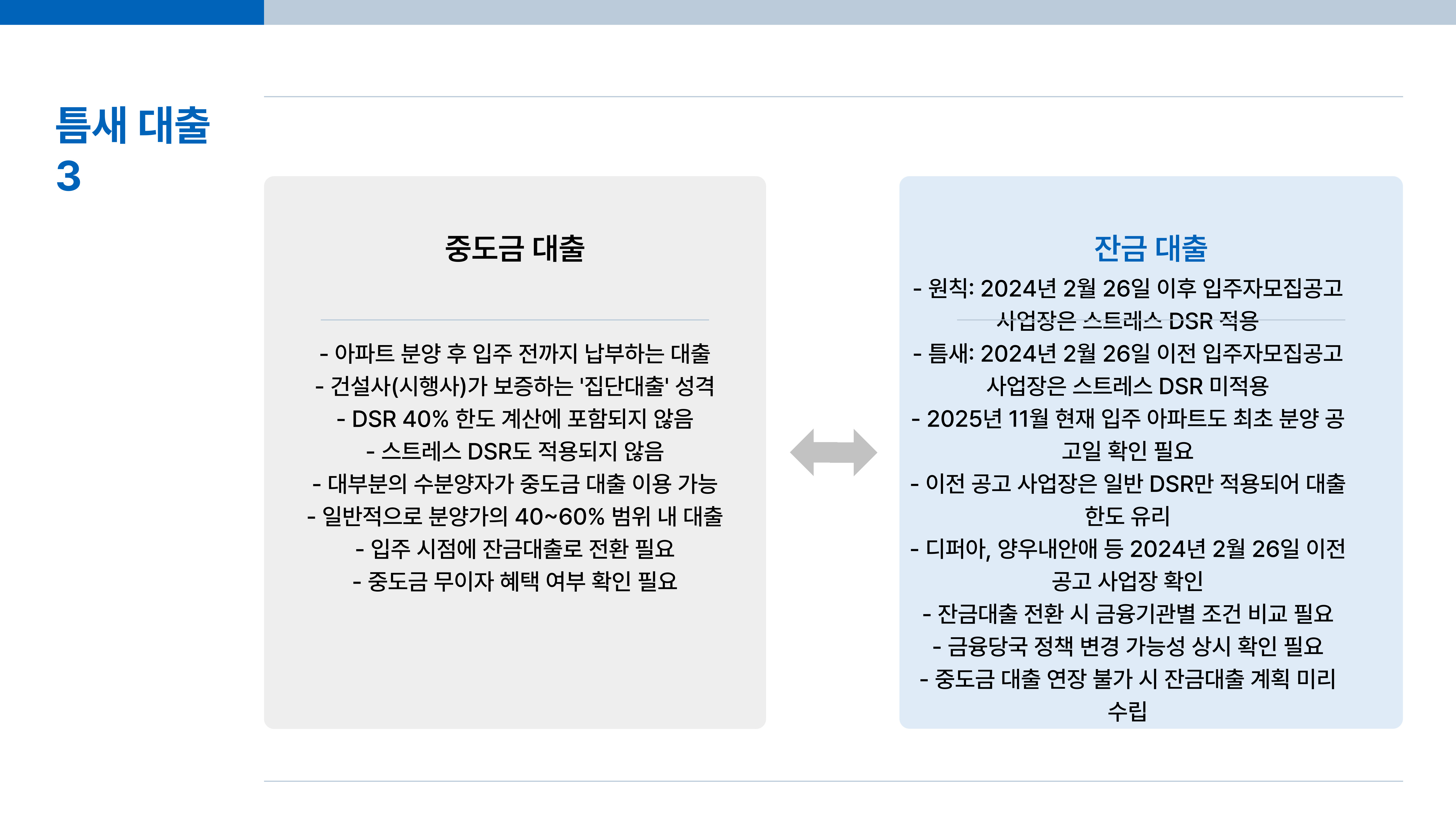 • ⭐ 틈새 (구 계약자):** 하지만, 스트레스 DSR 제도 시행일(2024년 2월 26일) 이전에 **이미 입주자모집공고가 나갔던 사업장**의 잔금대출은 **스트레스 DSR 적용에서 제외**됩니다. (즉, 일반 DSR 40%만 적용)
