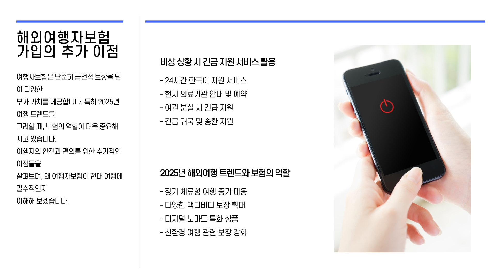 - 2025년 해외여행 트렌드와 보험의 역할: 자유여행 증가, 장기 체류형 여행, 다양한 액티비티 참여 등 여행 스타일이 다양해지면서 예기치 못한 위험에 노출될 가능성도 커지고 있어 보험의 중요성이 더욱 부각됩니다.