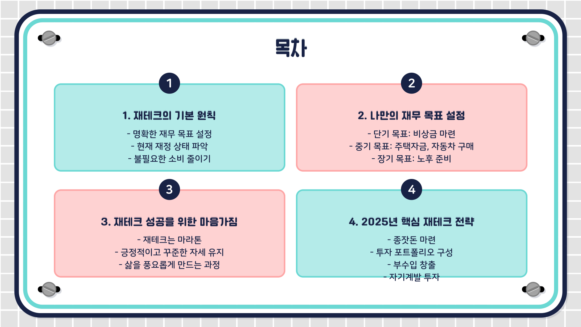- 긍정적이고 꾸준한 마음가짐: 재테크는 단거리 경주가 아닌 마라톤입니다. 조급해하지 않고 꾸준히 실천하는 자세가 중요합니다.