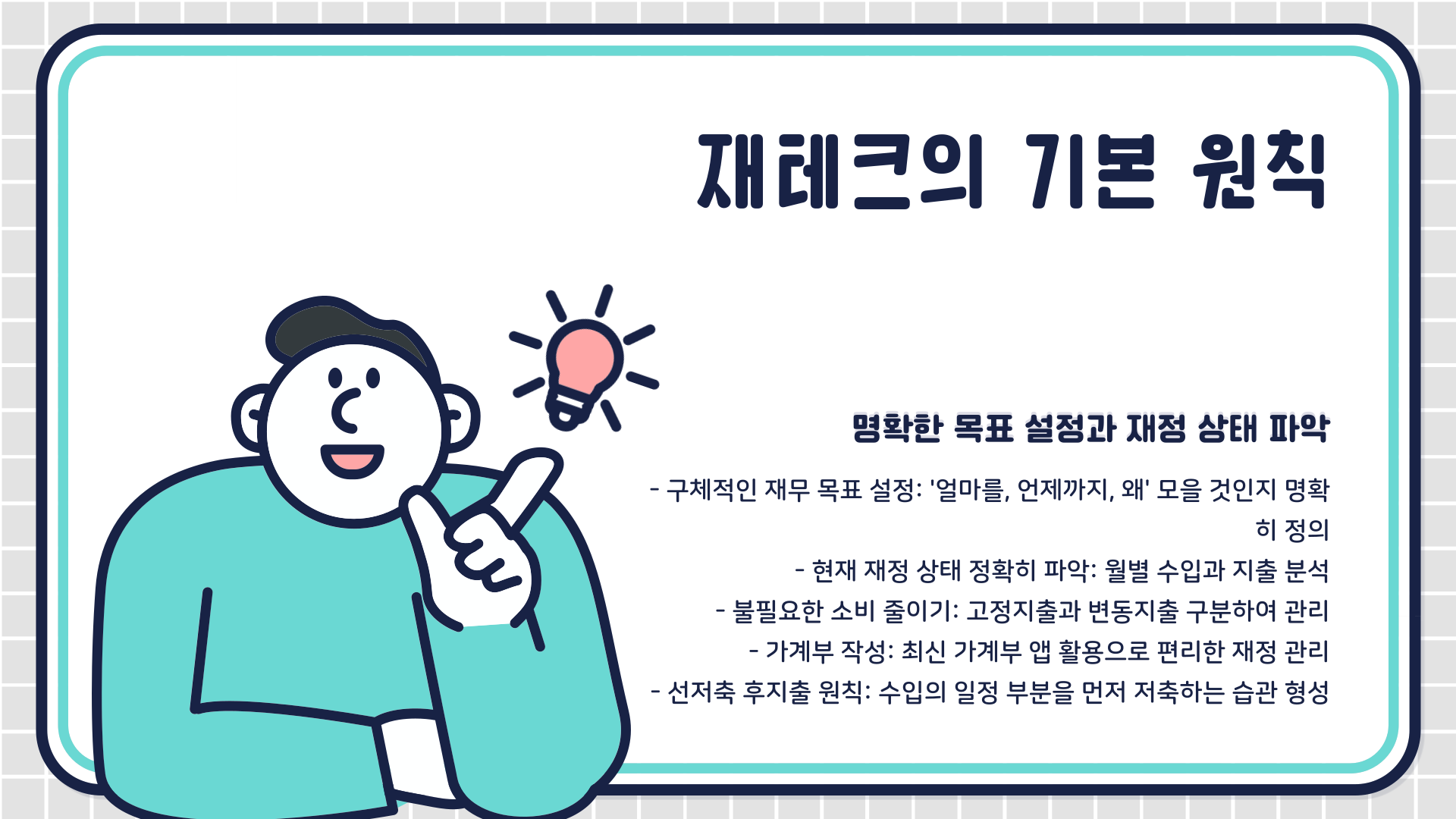 - 나만의 재무 목표 설정: 단기(비상금 마련), 중기(주택자금, 자동차 구매), 장기(노후 준비) 등 구체적인 목표와 기간 설정하기.