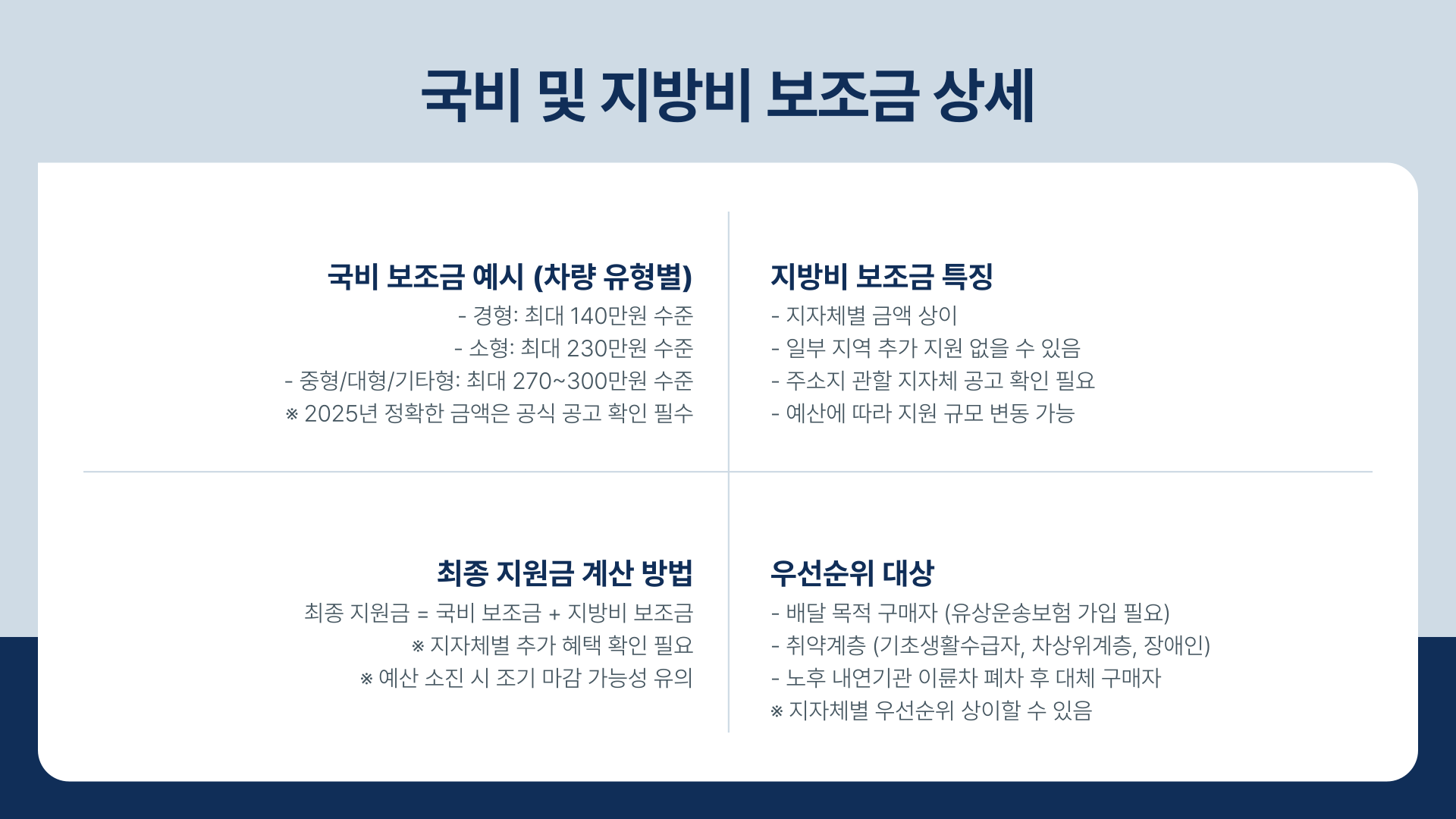 - 지자체별 예산 및 세부 조건의 중요성: 국비 보조금 외에 지방비 보조금은 지자체의 예산 상황에 따라 규모와 조건이 크게 다르고, 선착순 마감으로 인해 조기에 예산이 소진될 수 있습니다. 반드시 구매 계약 전 본인 거주지 지자체의 공고를 확인하고, 대리점을 통해 잔여 예산 등을 문의해야 합니다.