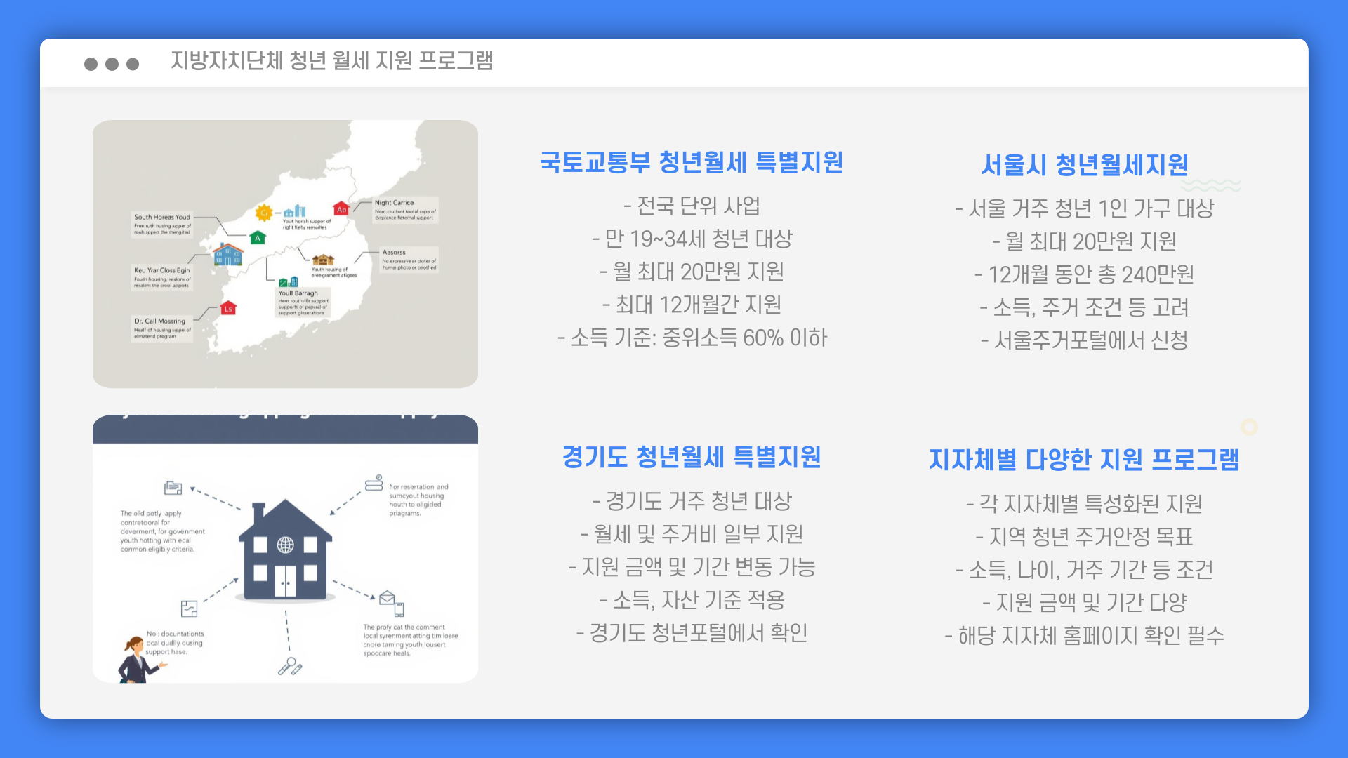 - 경기도 청년월세 특별지원: 경기도 거주 청년 대상 지원.