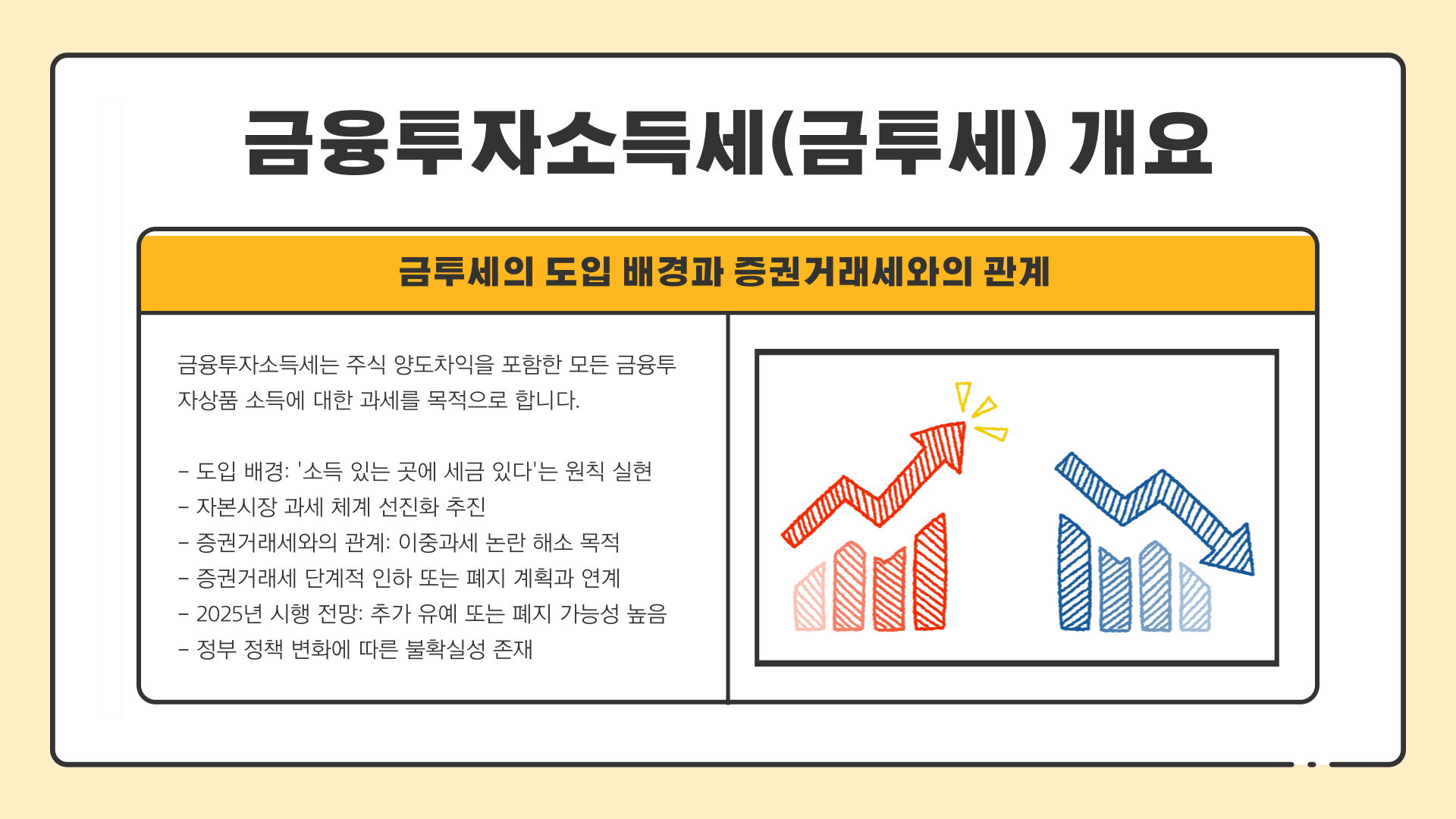 - 투자자 입장에서는 금투세와 증권거래세 관련 정책 변화에 지속적인 관심을 가지고, 공식적인 발표를 통해 정확한 정보를 확인하는 것이 중요합니다. (기획재정부 세제 관련 발표 참고)