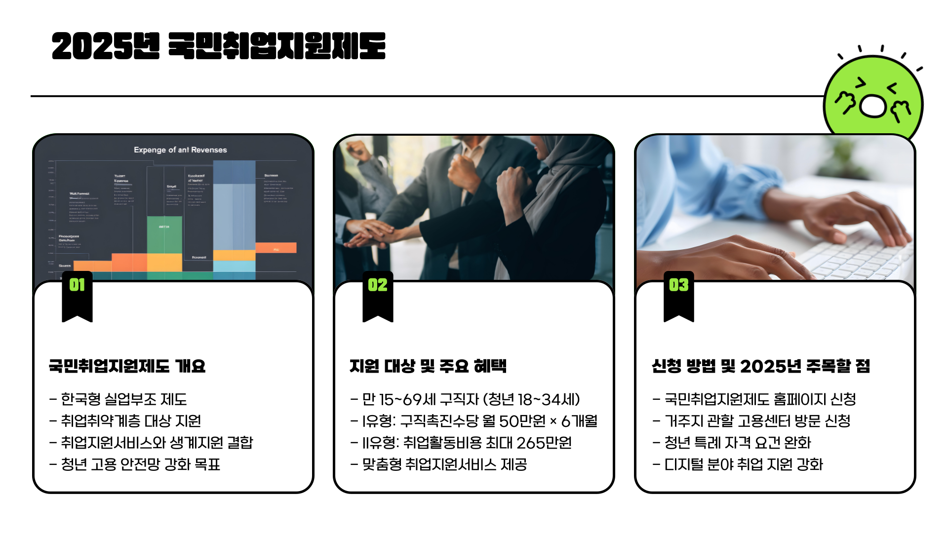 - 신청 방법: 국민취업지원제도 홈페이지 또는 거주지 관할 고용센터.