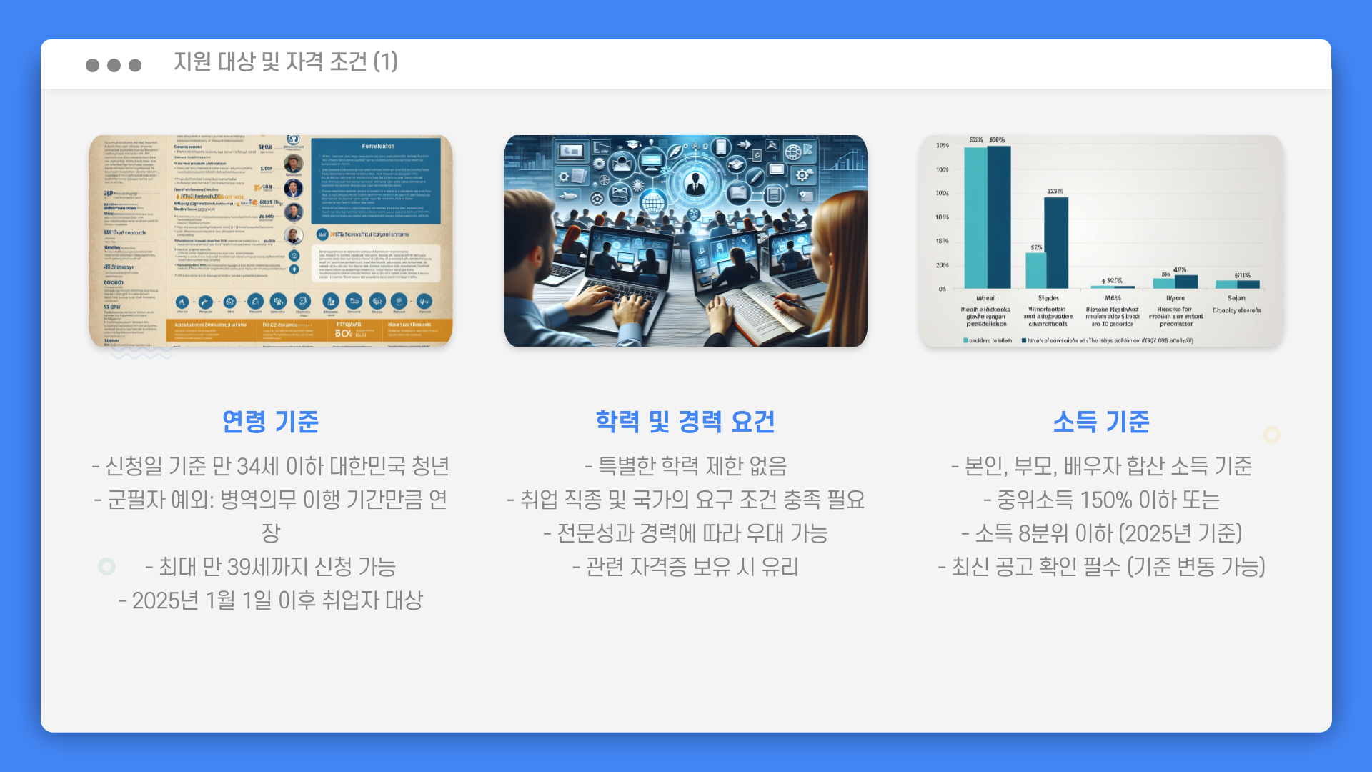 - 연령 기준: 신청일 기준 만 34세 이하인 대한민국 청년. (단, 군필자의 경우 병역 의무 이행 기간만큼 신청 연령 연장 가능, 최대 만 39세까지)
