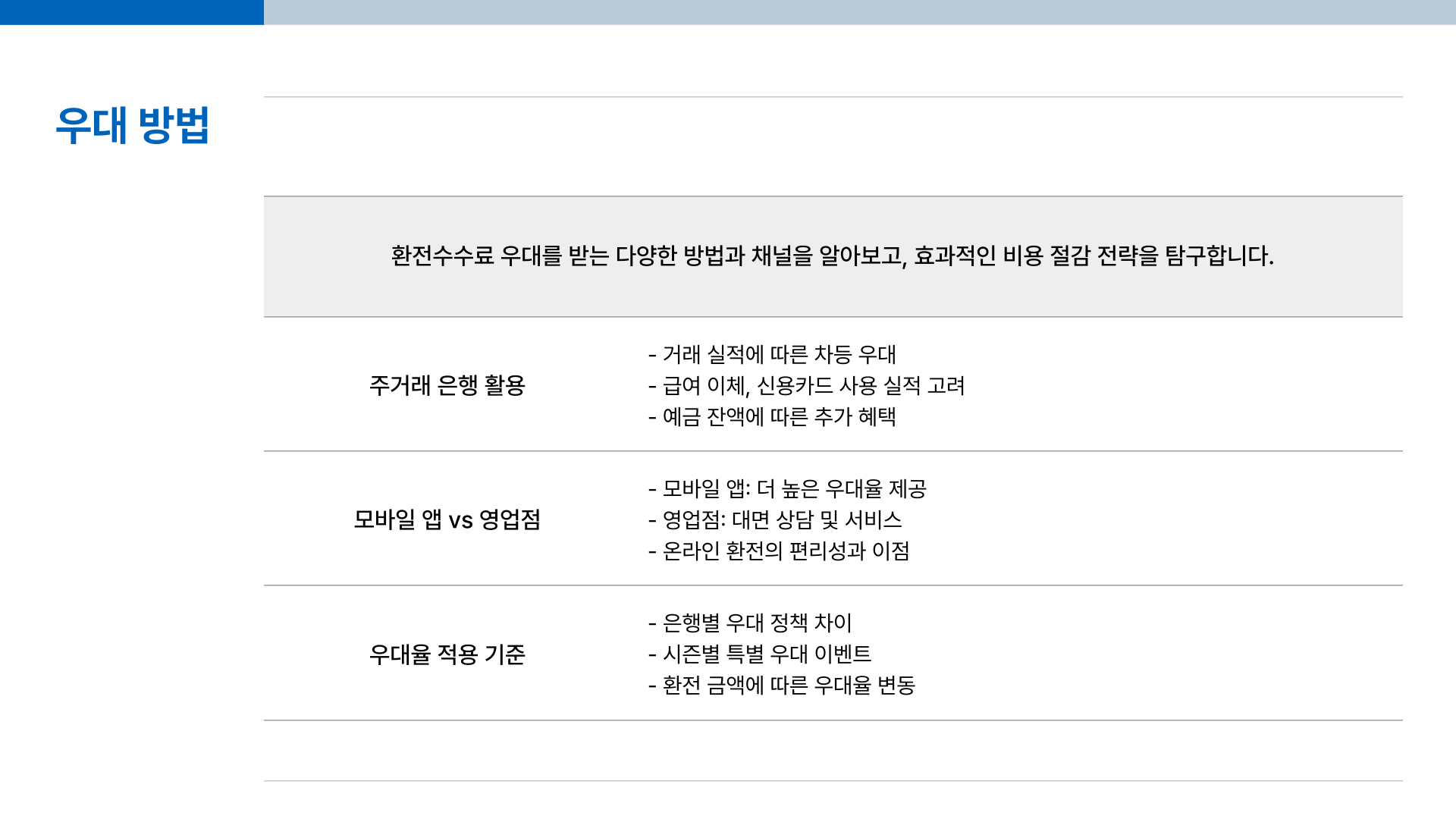 - 환전 금액대별 우대 조건 확인: 일정 금액 이상 환전 시 추가 우대를 제공하는 곳도 있으니, 예상 환전 금액에 맞춰 유리한 곳을 선택하세요.