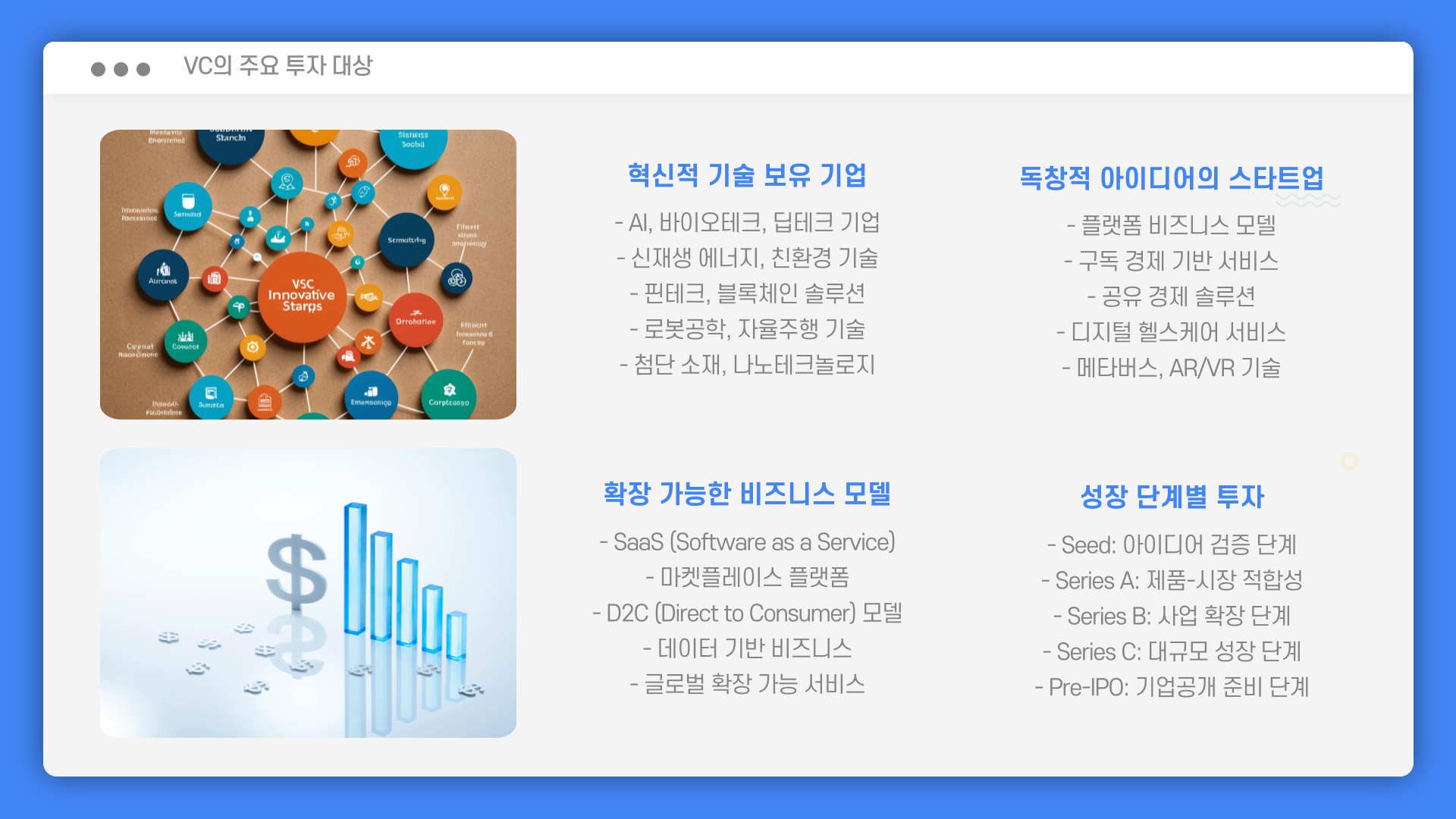 - 주요 투자 대상: 혁신적인 기술, 독창적인 아이디어, 확장 가능한 비즈니스 모델을 가진 비상장 초기 기업 (Seed, Series A, B, C 등 성장 단계별 투자).