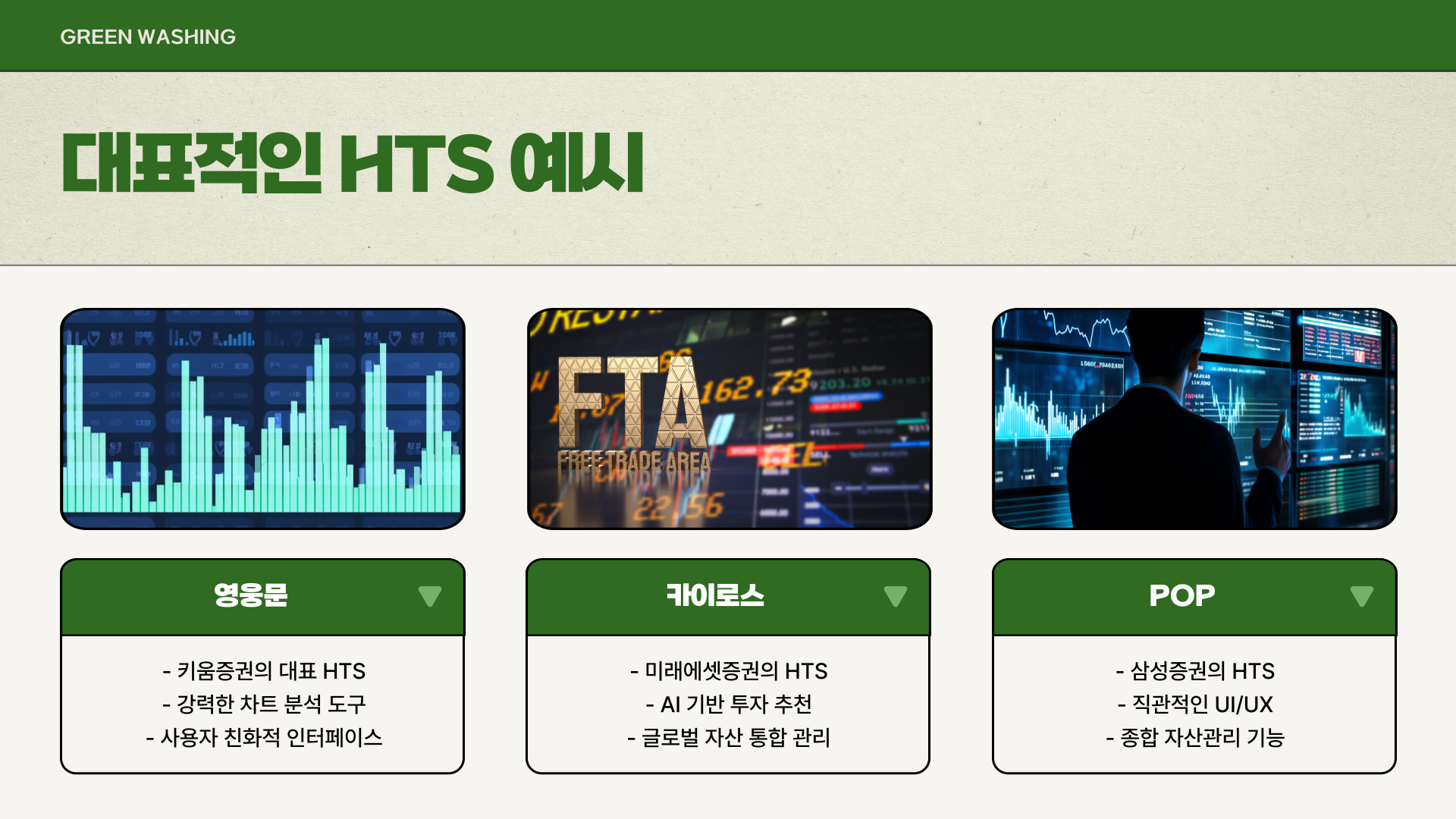 • 대표 HTS 예시: 키움증권의 '영웅문', 미래에셋증권의 '카이로스(KAIROS)', 삼성증권의 'POP' 등이 널리 알려져 있습니다.